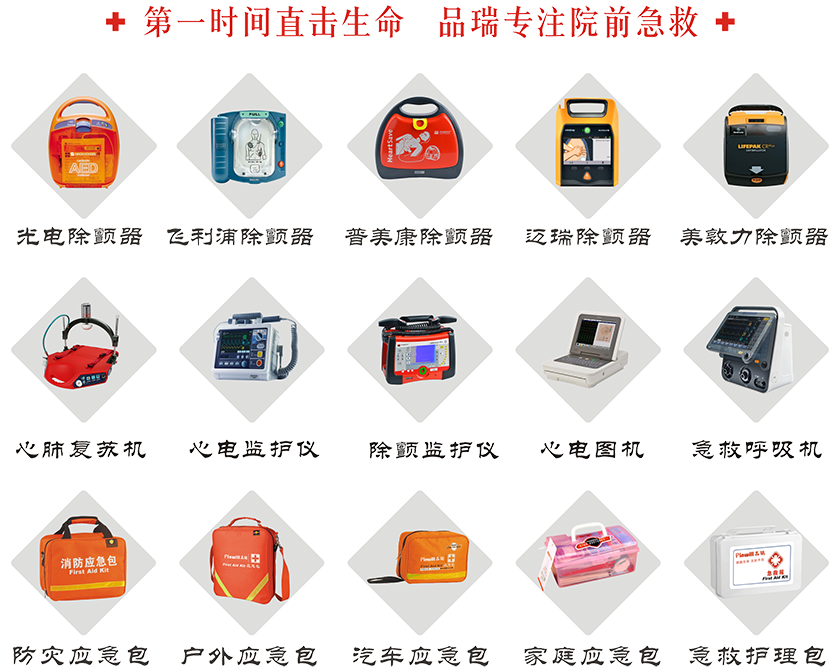 (1)院前急救设备:自动体外除颤器AED(德国普美康AED、国产迈瑞AED、飞利浦AED、美敦力AED、日本光电AED)、除颤监护仪、心肺复苏机、急救转运呼吸机、心电图机等医疗急救、监护设备;