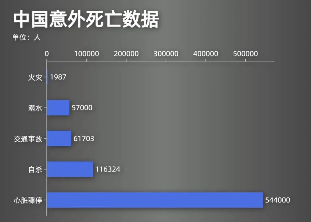 中国每年有约54.4万人因为心脏骤停而去世。55.4万人是什么概念呢?让我们对比一下其他因为意外死亡的人数。