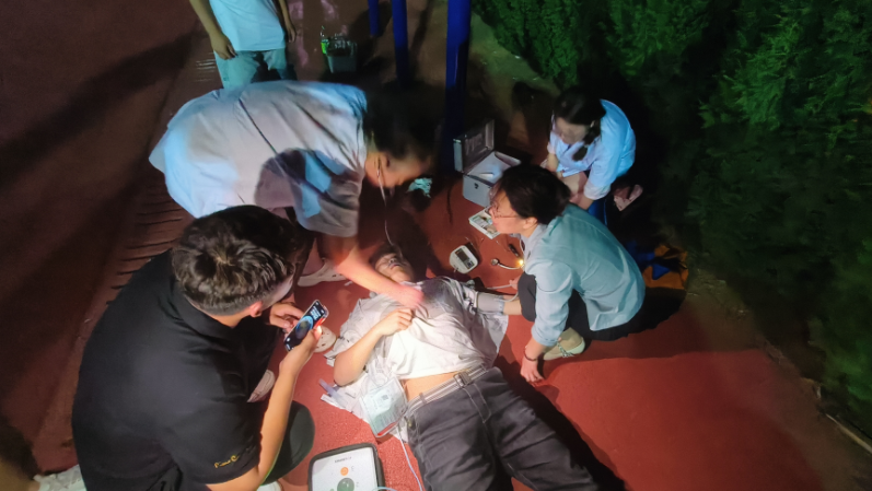 此时已经抵达现场的校党委委员、副校长段东旭临危不乱地进行现场指挥,“赶快去航空馆拿AED!”,“这位同学去大门口接120,这两位同志维护好现场秩序!”他一边安排,一边做好随时接手按压的准备。参与施救的国护队学生贺浩浩立刻去航空馆取来AED,张将宝与另一名参加过应急救护培训的学生尹武骏,互相配合,用AED 进行除颤。经过30分钟的院前急救,伤员呼吸和心跳逐渐恢复。