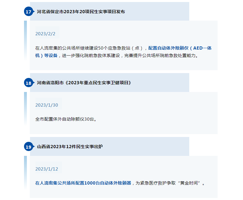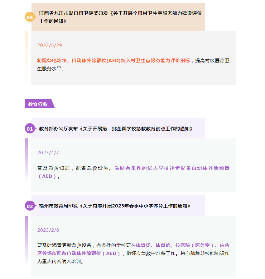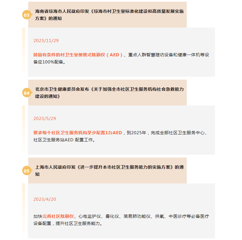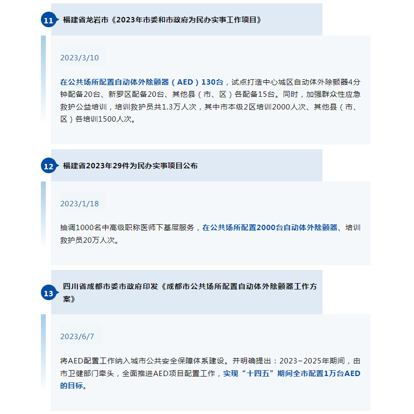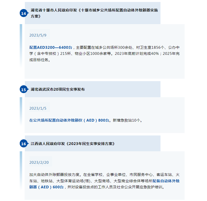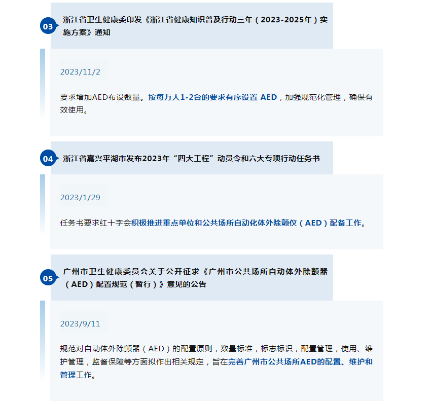 自国家相关部门下发积极推广AED文件,陆续其他省份地区也下发相关支持AED公共急救等文件,全国各地亦纷纷响应,从省、市到县、乡、村陆续出台配置AED的相关政策、文件,加快了国内AED的推广和普及速度。