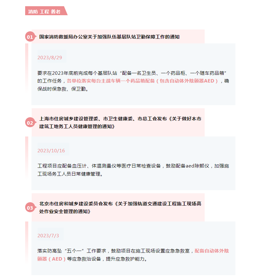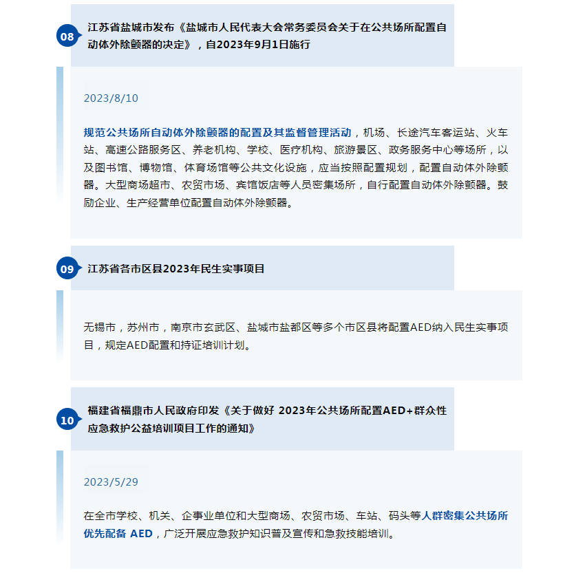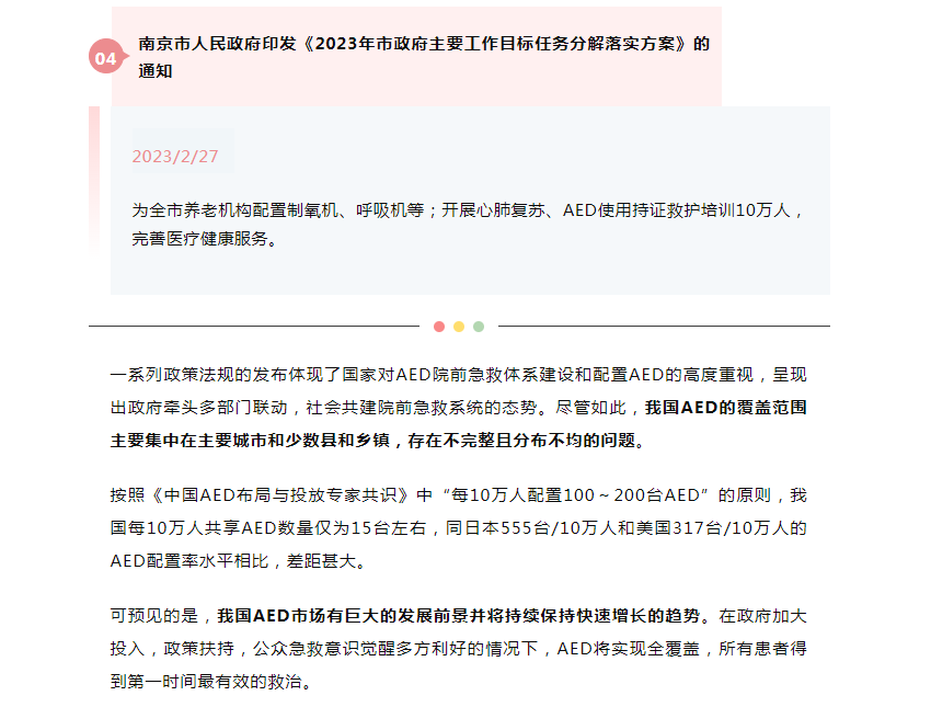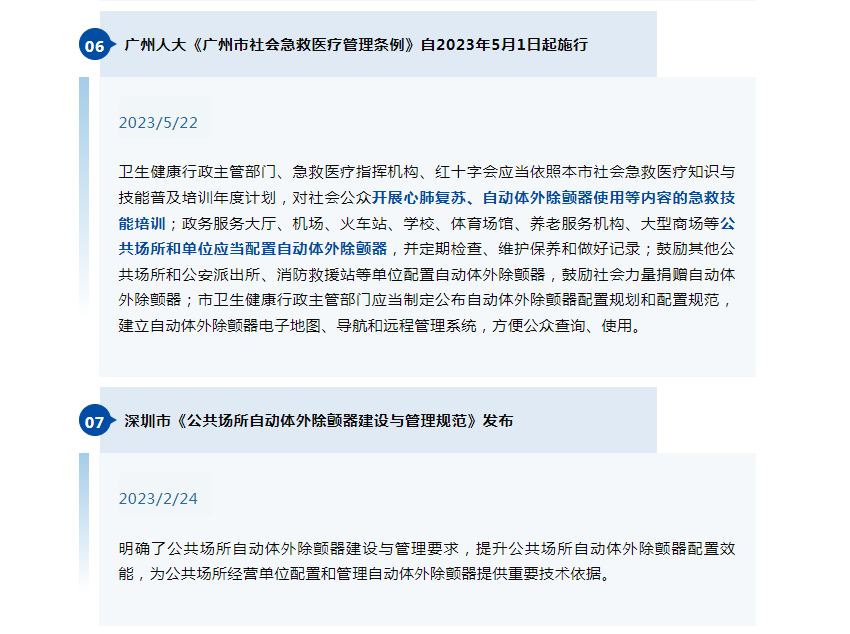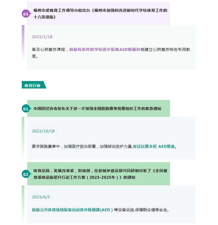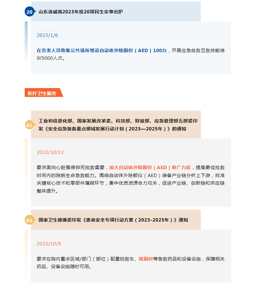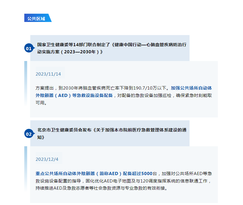 自国家相关部门下发积极推广AED文件,陆续其他省份地区也下发相关支持AED公共急救等文件,全国各地亦纷纷响应,从省、市到县、乡、村陆续出台配置AED的相关政策、文件,加快了国内AED的推广和普及速度。