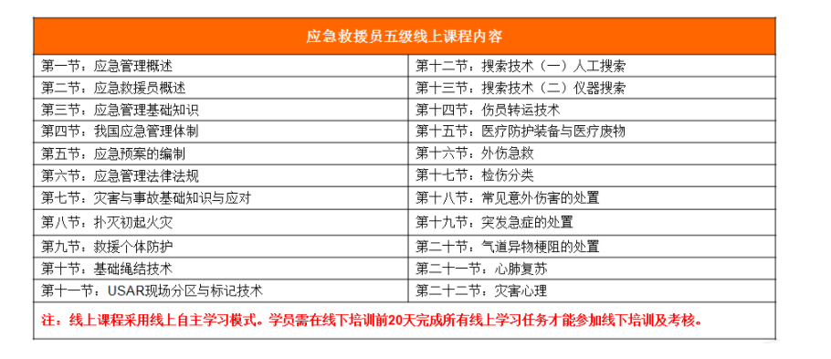 1、线上培训:线上课程2周内完成,在开始线下课程之前必须完成线上课程(线上课程为国家应急管理部紧急救援促进中心指定官网学习)