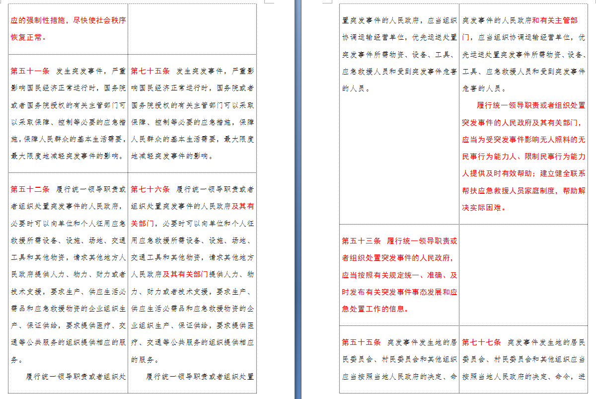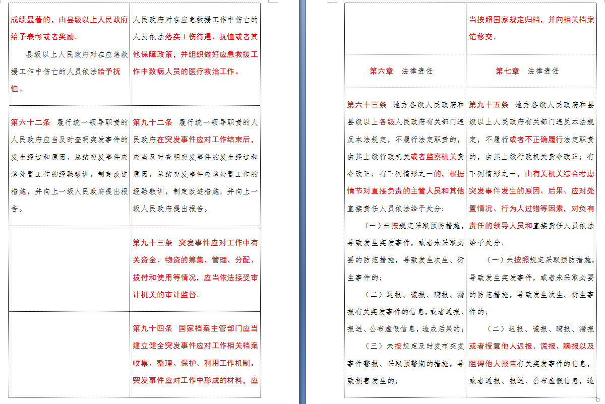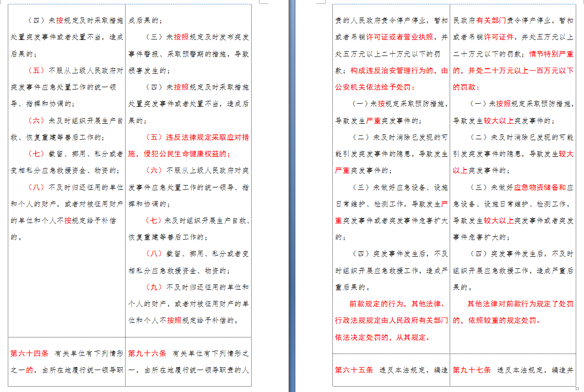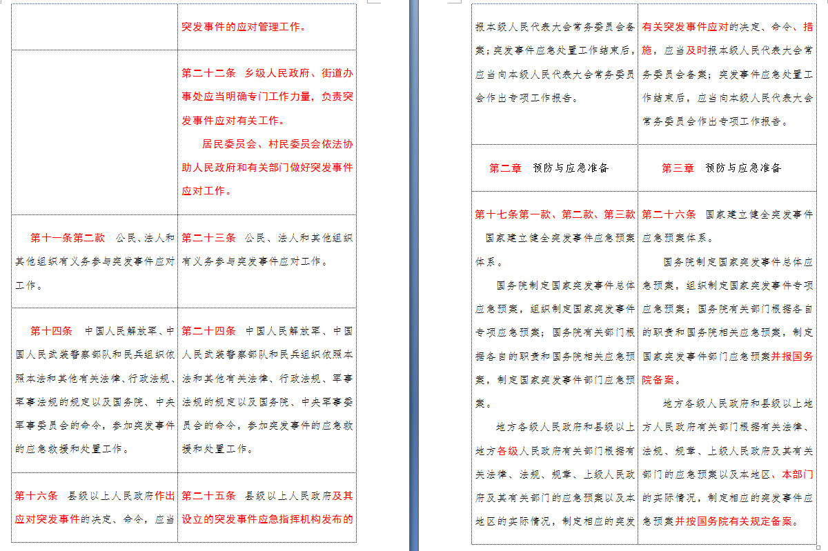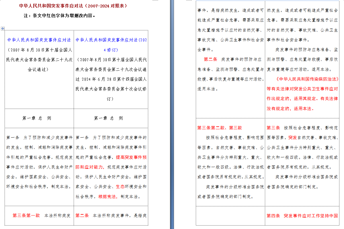 以下是 中华人民共和国突发事件应对法(2007-2024对照表)注:条文中红色字体为增删改内容: