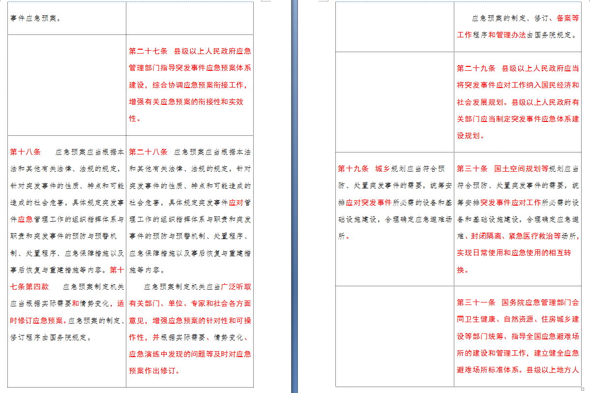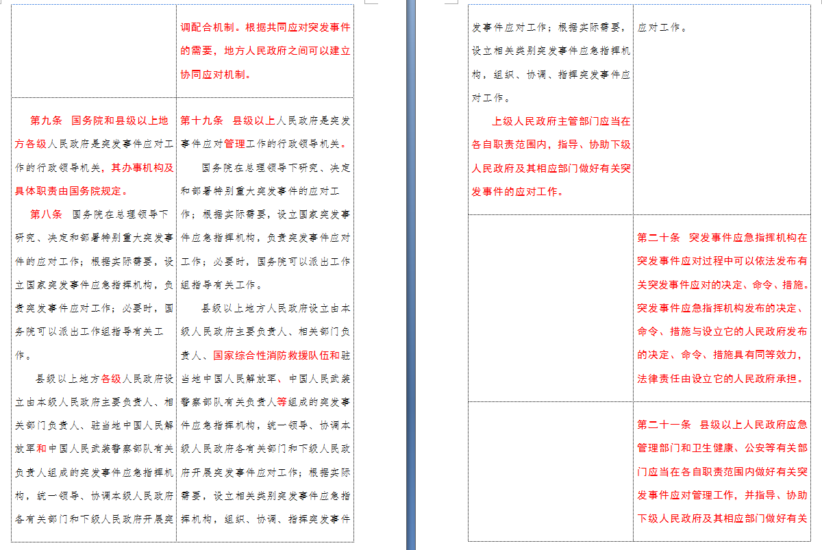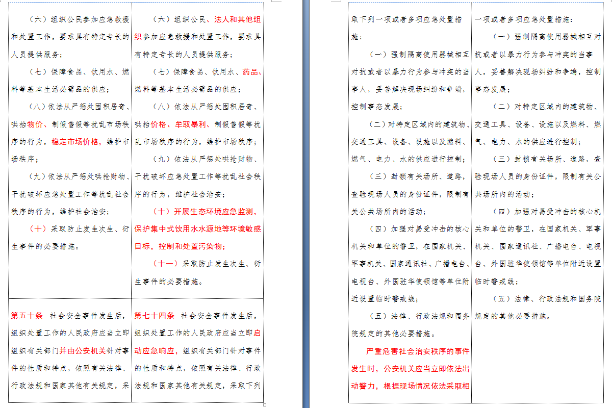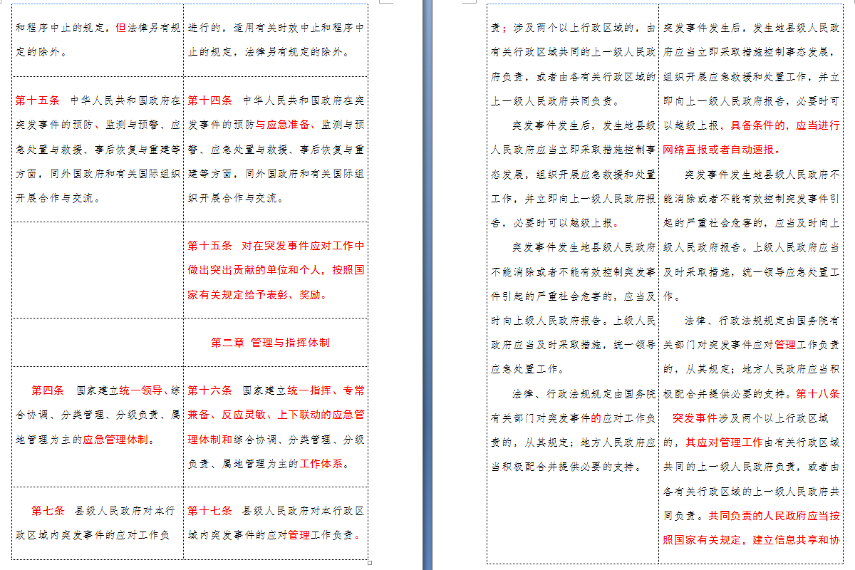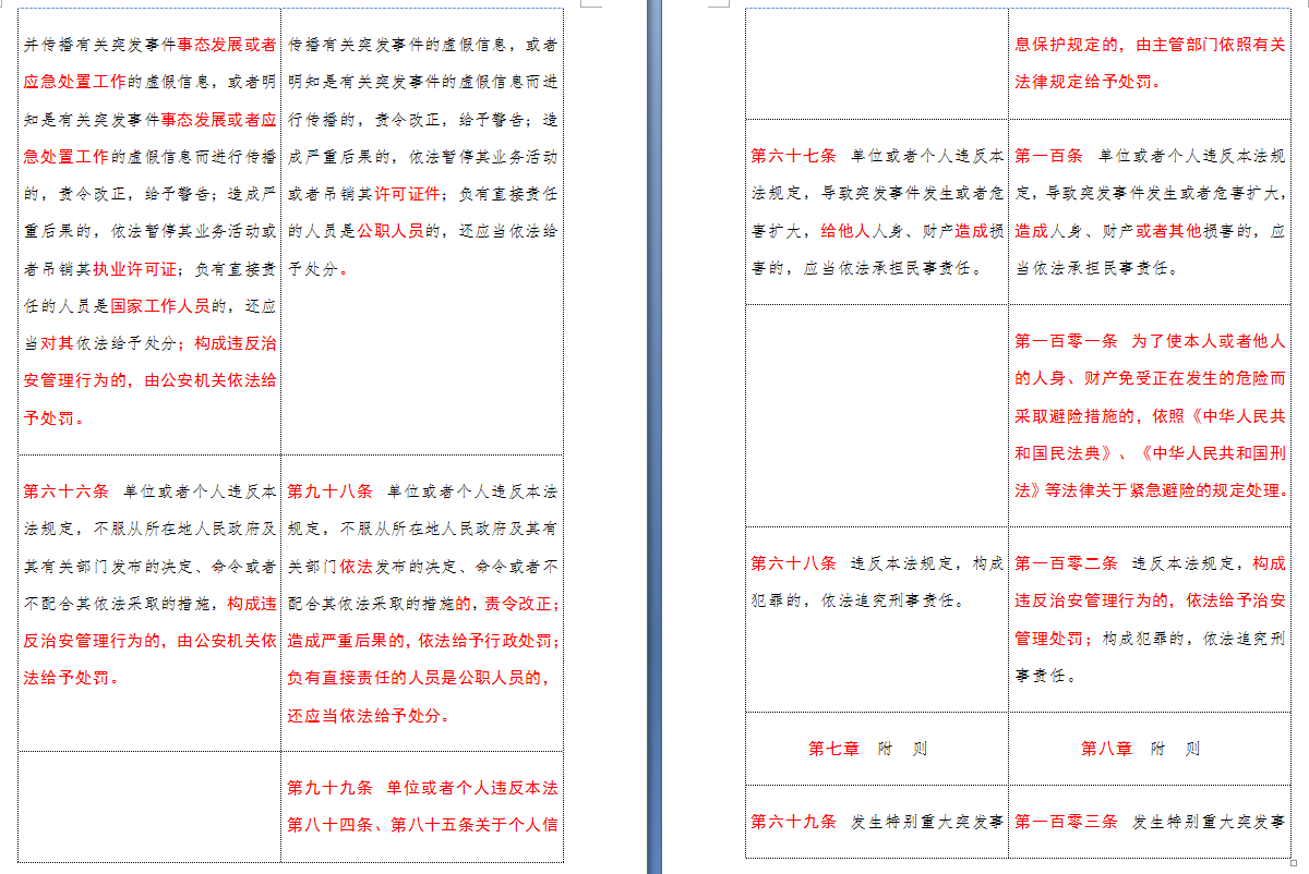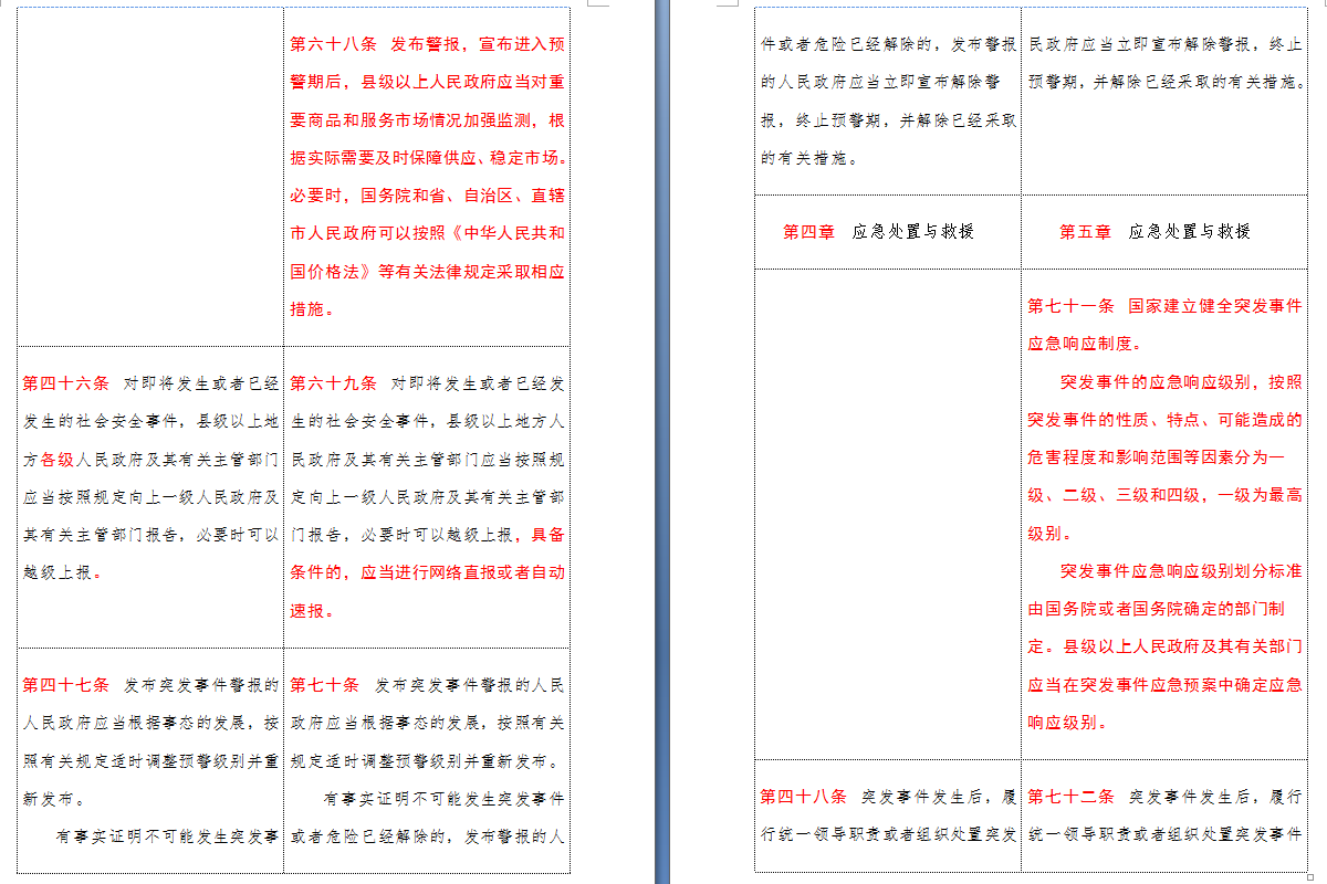 以下是 中华人民共和国突发事件应对法(2007-2024对照表)注:条文中红色字体为增删改内容: