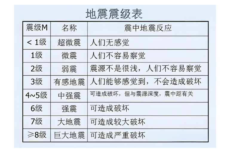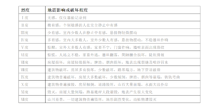地震烈度是指地面及房屋等建筑物受地震破坏的程度。对同一个地震,不同的地区,烈度大小是不一样的。距离震源近,破坏就大,烈度就高;距离震源远,破坏就小,烈度就低。从1度到12度共分12个烈度等级。