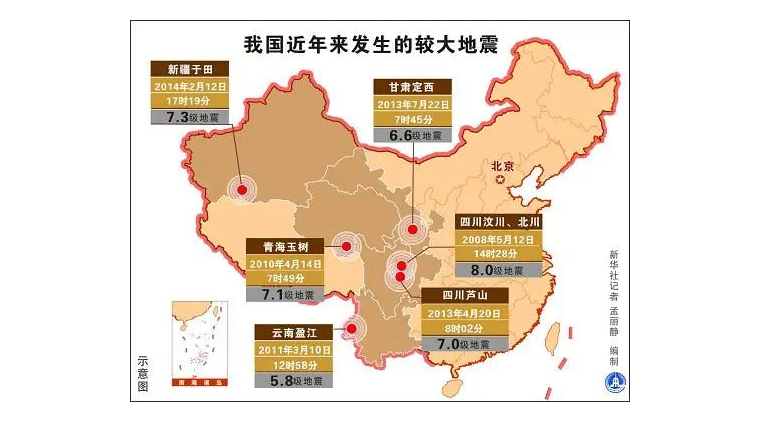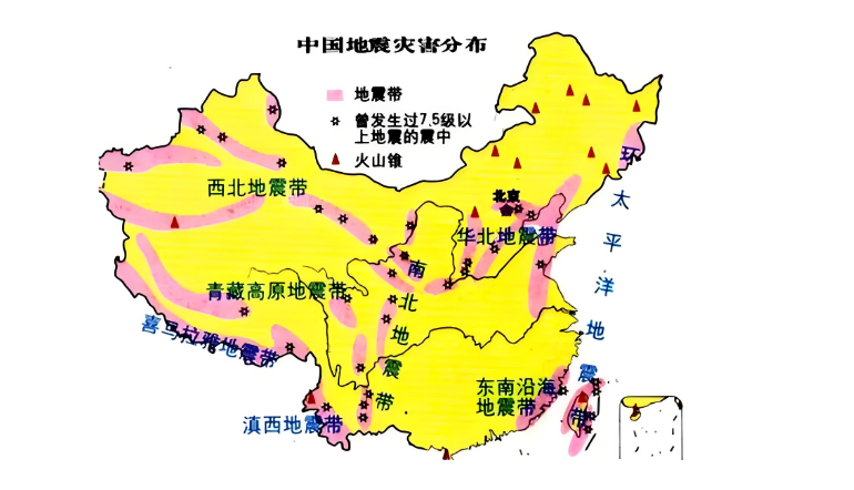 中国位于世界两大地震带――环太平洋地震带与欧亚地震带之间,受太平洋板块、印度板块和菲律宾海板块的挤压,地震断裂带十分活跃。中国地震主要分布在五个区域:台湾省、西南地区、西北地区、华北地区、东南沿海地区和23条地震带上。