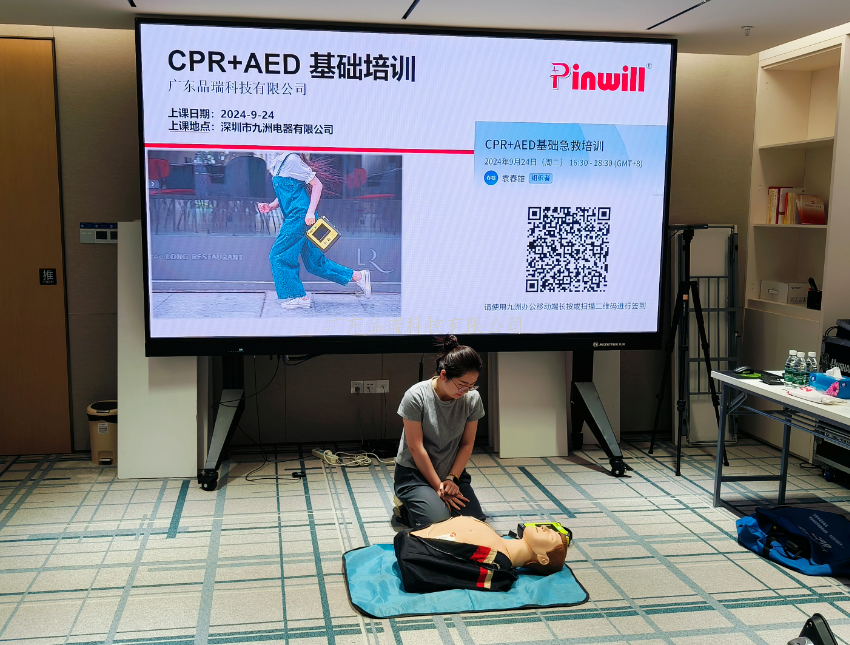 2024年9月24日深圳一电器企业配置AED除颤仪,员工们齐齐学急救。