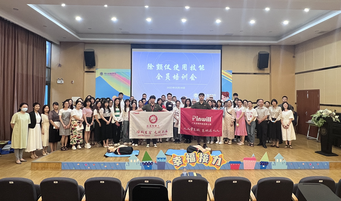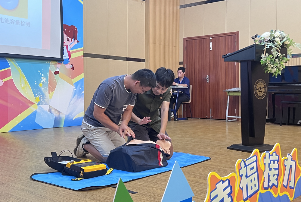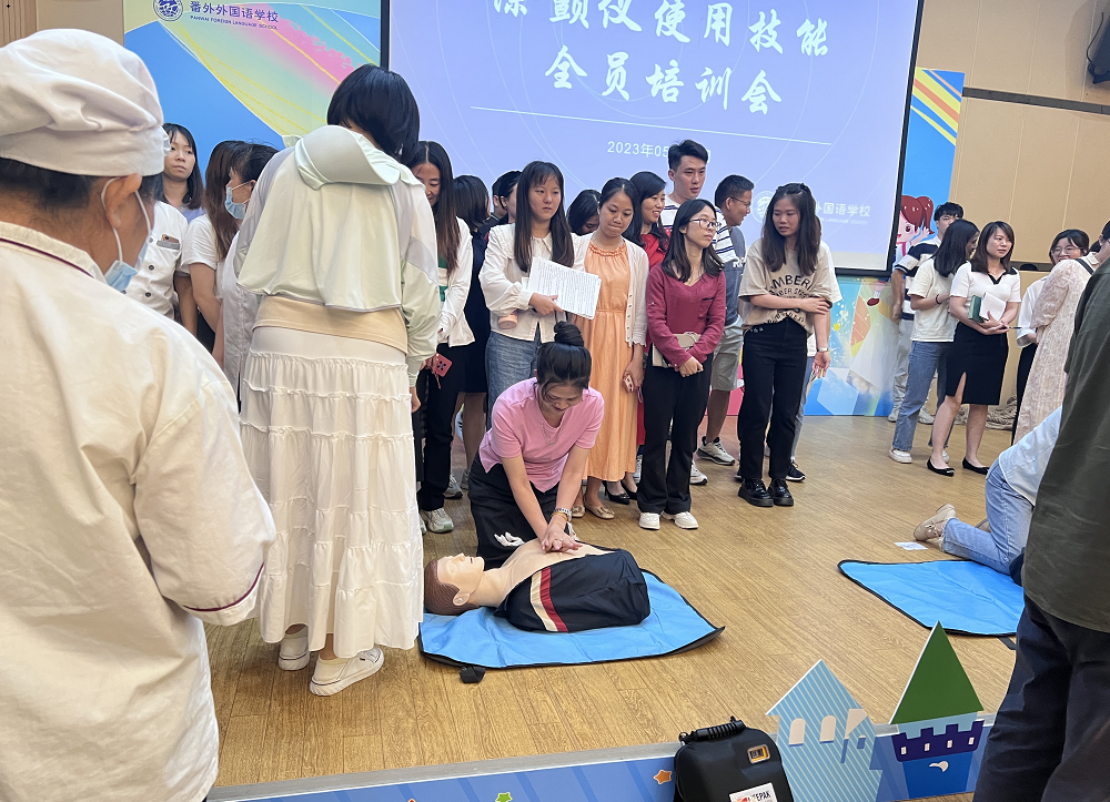 2023年5月30日,广东品瑞科技有限公司急救培训老师来到广州广外附设番禺外国语学校,对该校老师进行AED除颤仪使用技能全员培训会。
