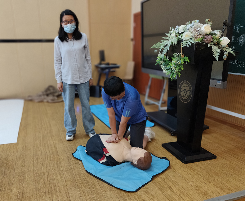 当然这次校园急救知识培训,也少不了心肺复苏CPR的教学,通过对人体进行按压达到对患者施救的目的,心肺复苏是一种学习过后人人都会做的急救本领。虽然它没有AED使用后的效果,但是通过心肺复苏CPR能够使生命延续,在等待AED和救护车到来前是急救的“制胜法宝”!
