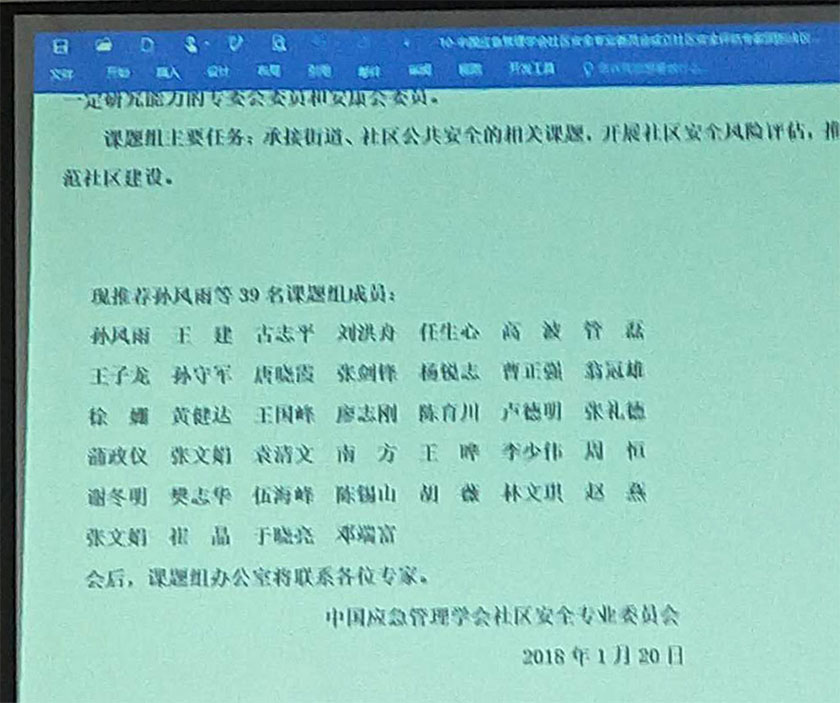 此外,本次研讨会还成立了社区安全评估与安防体系建设课题组,产生了孙凤雨、王建、古志平、刘洪舟、翁冠雄、陈育川等39名课题组专家成员,为国家社区安全评估与安防体系的建设建言献策。