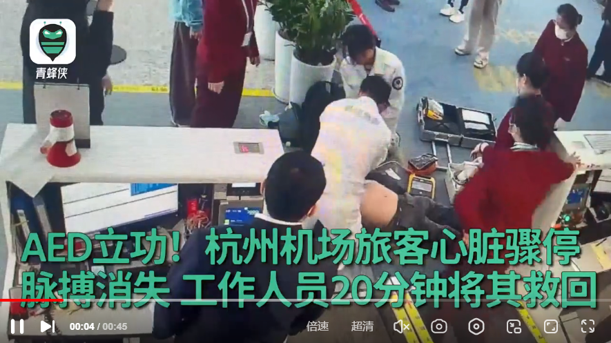 AED立功!杭州机场旅客心脏骤停脉搏消失,工作人员20分钟将其救回。