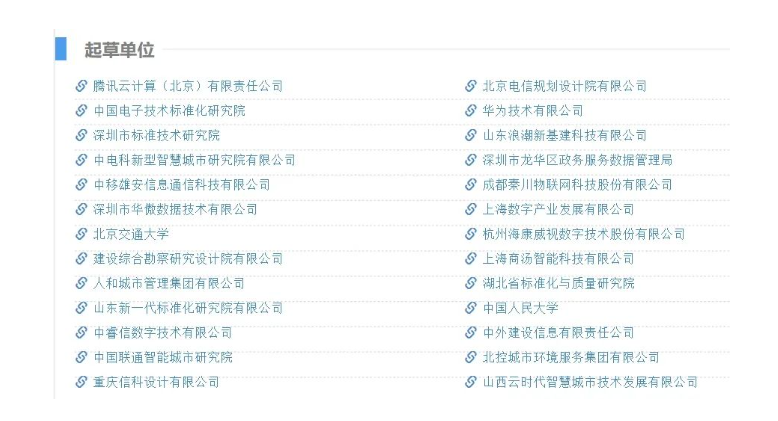 主要起草单位 腾讯云计算(北京)有限责任公司 、北京电信规划设计院有限公司 、中国电子技术标准化研究院 、华为技术有限公司 、深圳市标准技术研究院 、山东浪潮新基建科技有限公司 、中电科新型智慧城市研究院有限公司 、深圳市龙华区政务服务数据管理局 、中移雄安信息通信科技有限公司 、成都秦川物联网科技股份有限公司 、深圳市华傲数据技术有限公司 、上海数字产业发展有限公司 、北京交通大学 、杭州海康威视数字技术股份有限公司 、建设综合勘察研究设计院有限公司 、上海商汤智能科技有限公司 、人和城市管理集团有限公司 、湖北省标准化与质量研究院 、山东新一代标准化研究院有限公司 、中国人民大学 、中睿信数字技术有限公司 、中外建设信息有限责任公司 、中国联通智能城市研究院 、北控城市环境服务集团有限公司 、重庆信科设计有限公司 、山西云时代智慧城市技术发展有限公司 。