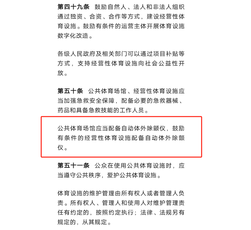 其中《条例》第五十条明确要求:“公共体育场馆、经营性公共体育场馆应当配备自动体外除颤仪,鼓励有条件的经营性体育设施配备自动体外除颤仪”。