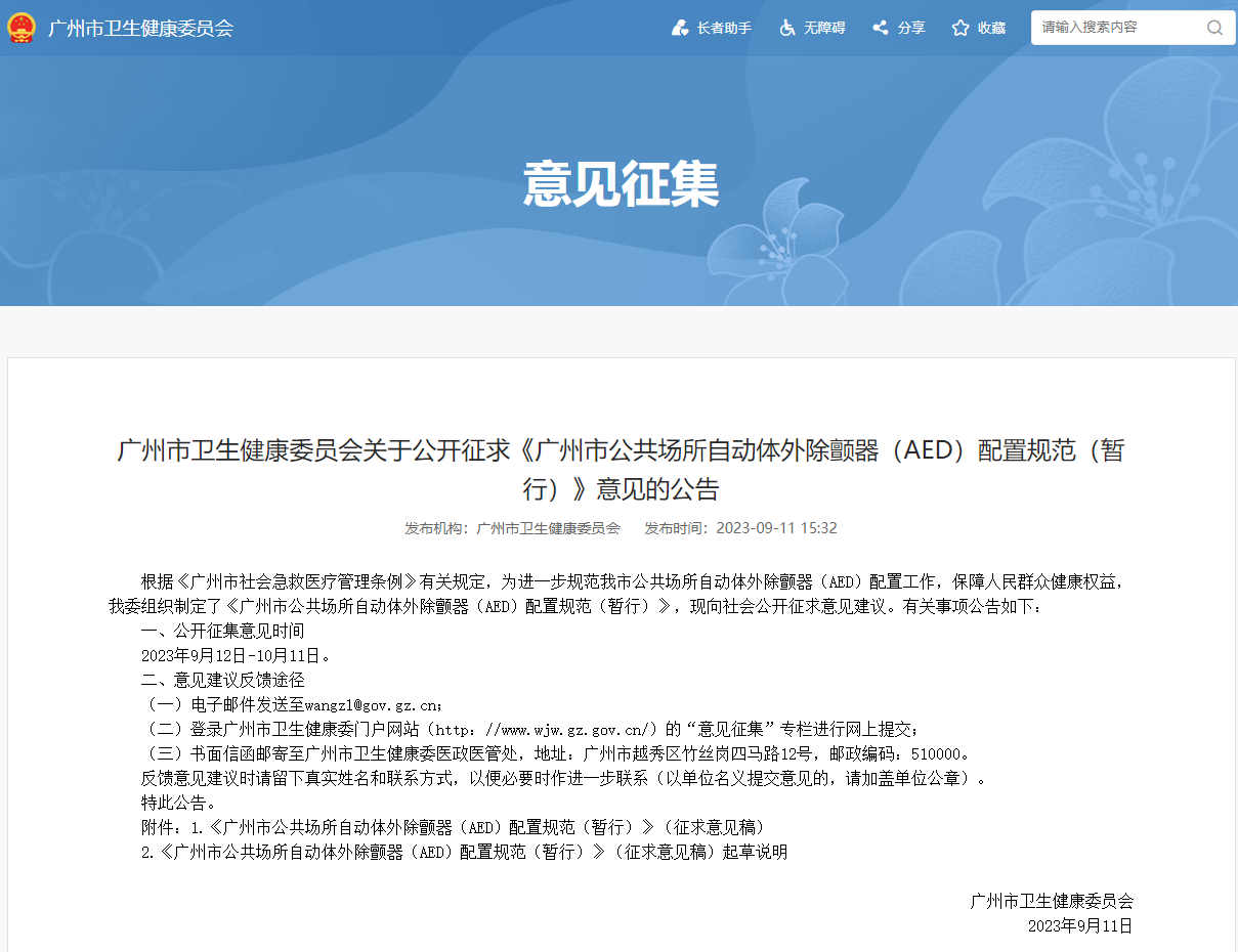 广州市AED政策动态,AED配置的意见公告,它将带来什么?内容提及各行业如何规范配置AED,对AED的管理数据系统的接入,AED维护工作的管理和执行,以及对急救培训的相关内容信息,详情可到下方链接进行下载解读: