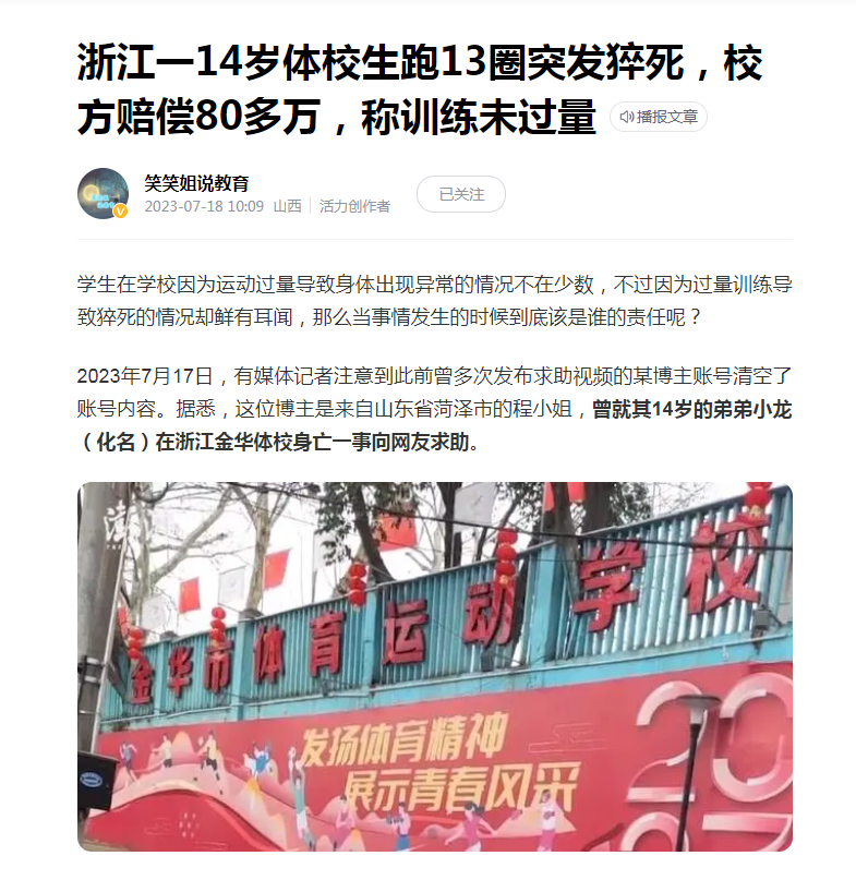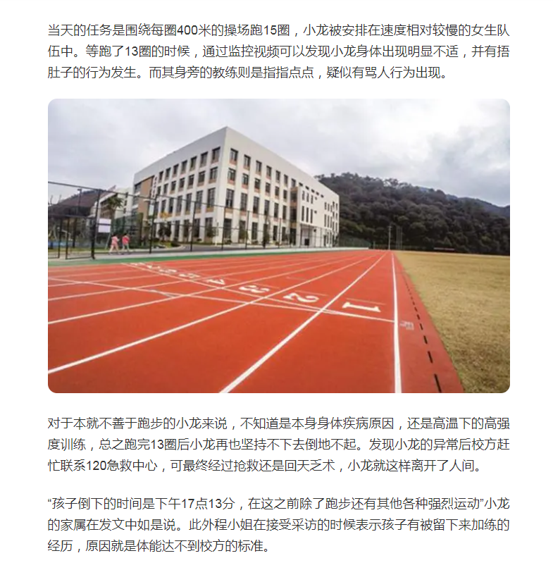 对于听闻此类的信息,小编每次都会深感震撼。一条宝贵的生命,来之不易,父母辛苦把儿女养大也更经历无尽的艰辛。然而作为体校,高强度训练也在所难免,毕竟“人不磨不成材,玉不琢不成器”。但是就像文章最后说得那样,锻炼或者训练要量力而行。同时老师也应该提高对学生容易造成意外事故的意识,并加强急救技能的训练,对于校园,也更应该配置好相应的急救设备,做好校园应急救护的预防措施!对此,不知道大家有什么看法?大家觉得这个80万的赔偿应该吗?校园在应对这些突发事件的发生,有哪些措施可以提前做好预防性工作?欢迎大家留言交流。