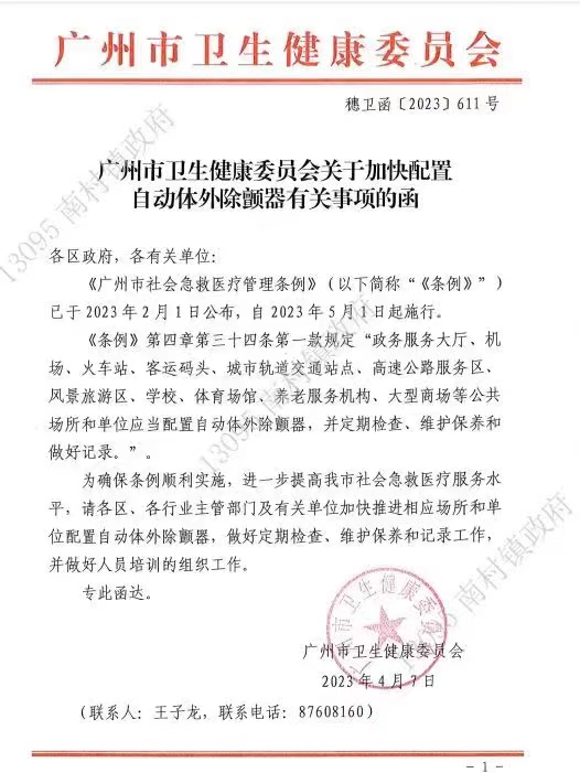 继之前广州市发布的关于《广州市社会急救医疗管理条例》对相关单位和场所推进配置自动体外除颤器(AED)和做好后续管理与维护的公告文件后。近日,广州市卫生健康委员会再次发布公告:关于加快配置自动体外除颤器有关事项,于2023年5月1日起正式实施的相关文件,标志着相关部门对推进配置AED除颤仪和加强后续管理维护,即将进入执法督促,如下是相关公告: