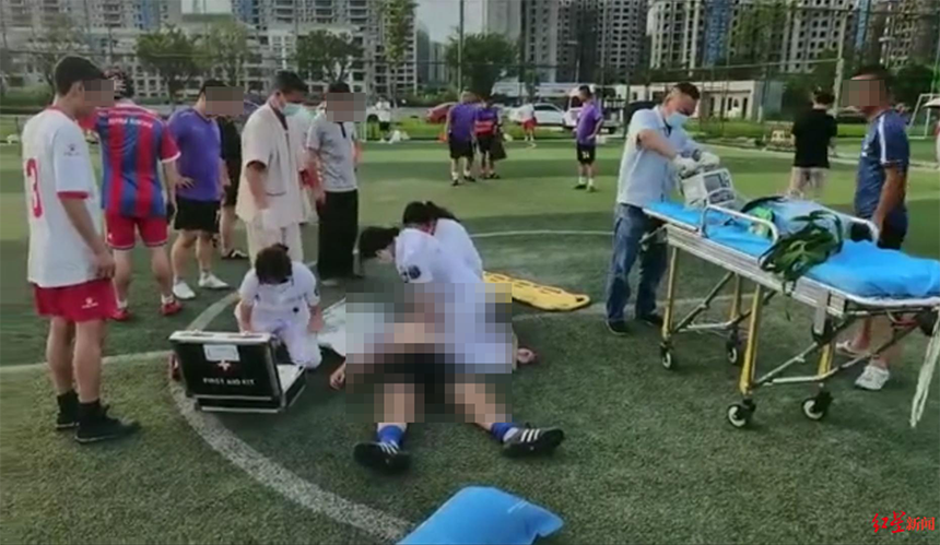 现场视频在成都多个足球爱好者微信群中流传。画面中,多名急救医务人员已赶到现场,正在对一名倒地不起的男子采取心肺复苏等措施,担架摆在旁边,还有几名身着球衣的足球爱好者守候在旁。