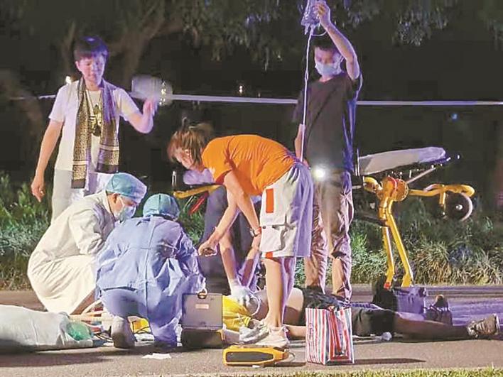 迅速用纸巾擦干患者胸前的汗水,用AED对患者进行一次除颤,随后继续心肺复苏。两分钟后,AED第二次检测,不建议除颤。易无庸持续心肺复苏。期间,一位市民、一位穿制服的警察和一位着便装自称是交警的男士说学过急救,自告奋勇上前替手。据了解,这位着便装的男士是龙华交警大队龙华中队二级警长曾志恒,“我们轮流为倒地的男子做胸外按压,还用上了AED,周围市民也主动协助维护抢救现场秩序,让无关人员不要靠近。直到20多分钟后救护车赶来。