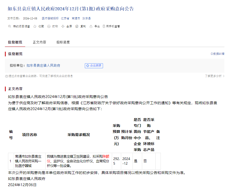 AED最新信息:如东县袁庄镇人民政府2024年12月(第1批)政府采购意向公告