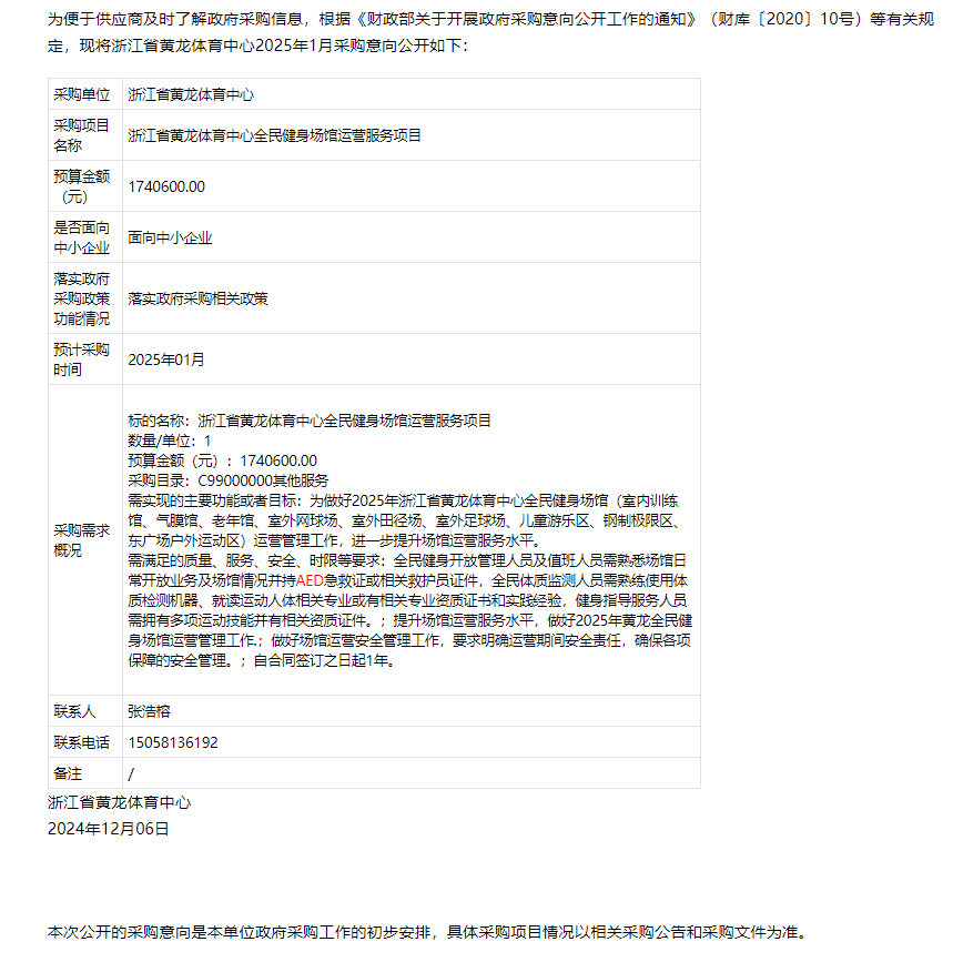 AED最新投标信息:浙江省黄龙体育中心全民健身场馆运营服务项目招标预告