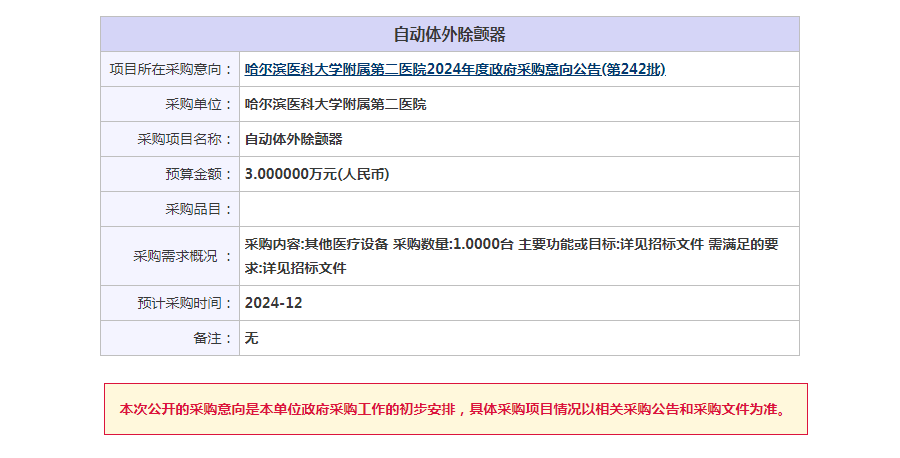 最新AED招投标信息:哈尔滨医科大学附属第二医院2024年度政府采购意向公告(第242批)-自动体外除颤器 详细情况