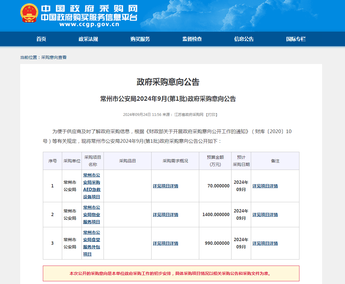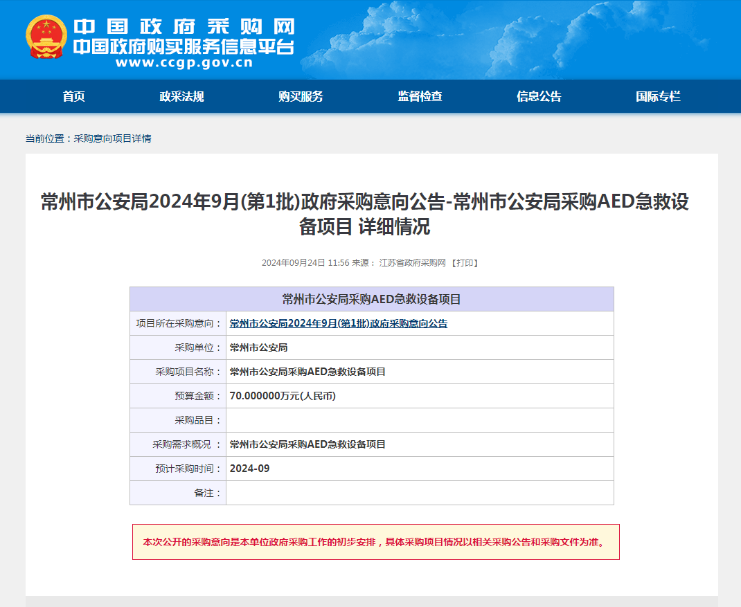常州市公安局2024年9月(第1批)AED急救设备政府采购意向公告