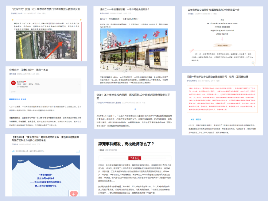 此外,近期还发生了多起校园猝死事件,如温州二十一中学生因急救技能不纯熟耽误救治、河南机电职业学院学生在运动会选拔赛时猝死等。同时,教师猝死事件也屡见不鲜,多位年轻教授因突发疾病去世。