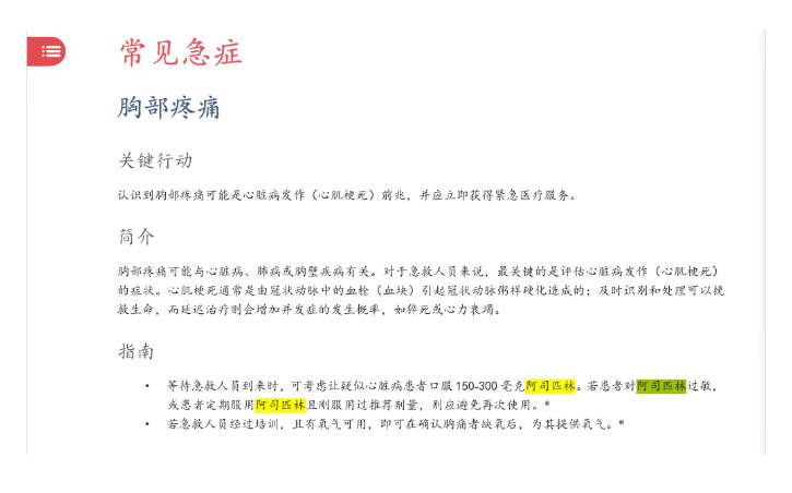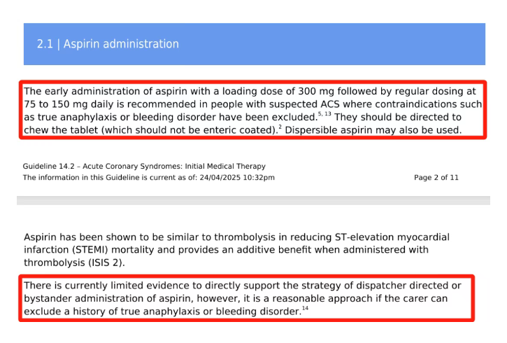 ANZCOR指南也提及,虽然目前直接支持调度员指导或旁观者服用阿司匹林策略的证据有限,但是如果护理人员能够排除真正的过敏反应或出血性疾病的病史,那么这也是一种合理的做法。