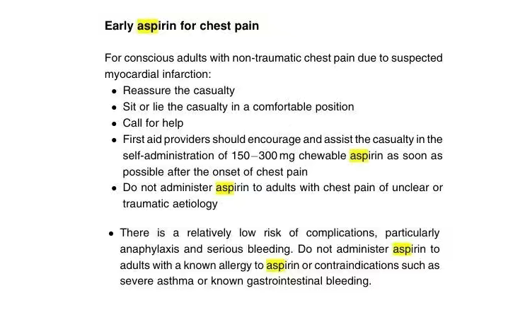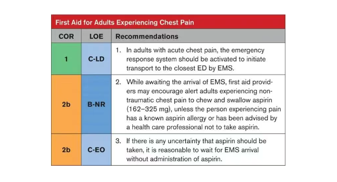 在等待紧急医疗服务到达期间,可鼓励出现非创伤性胸痛的清醒成人嚼服阿司匹林 (162毫克-325 毫克),除非患者已知对阿司匹林过敏或已被医疗保健专业人员建议不要服用阿司匹林。