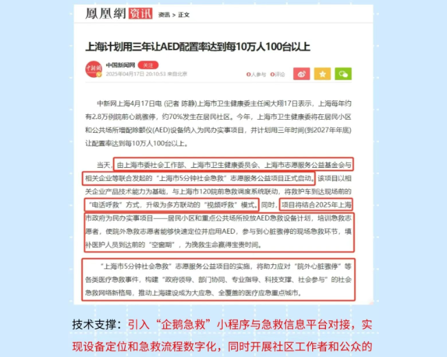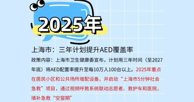 同时,项目将结合2025年上海市政府为民办实事项目——居民小区和重点公共场所投放AED急救设备计划,培训急救志愿者,使院外急救志愿者能够快速定位并启用AED,参与到心脏骤停的现场急救环节,填补医护人员到达前的“空窗期”,为挽救生命赢得宝贵时间。