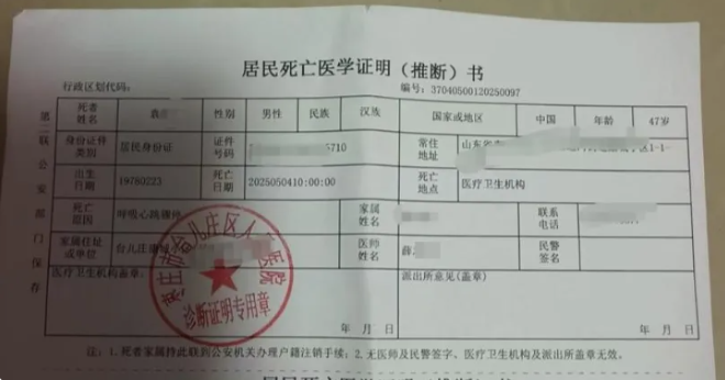 袁鹏的死亡医学证明(受访者供图)