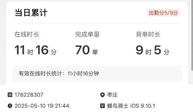 袁鹏的跑单软件上,他在5月1日、2日、3日在线时间均超过11小时,总计背单时长均超过8小时,跑单数则是48单、59单、70单。