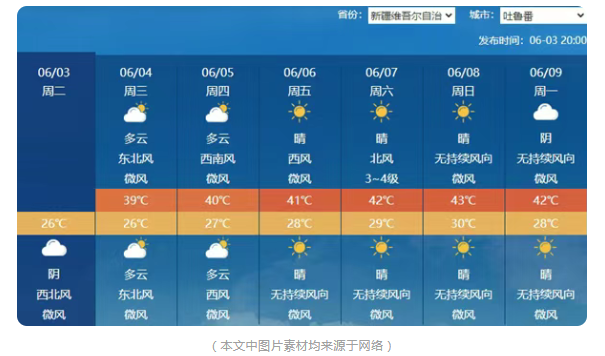视线转向西北,以吐鲁番盆地为核心的新疆高温区,更是高温强度的“王者”。这里的高温不仅来势汹汹,持续时间还格外长。从5日起,吐鲁番、托克逊等地的最高气温将如同被定住一般,连续达到或超过40℃ 。滚烫的地面能煎熟鸡蛋,空气里弥漫着令人窒息的燥热,高温天气给当地居民的生活和生产带来极大挑战。