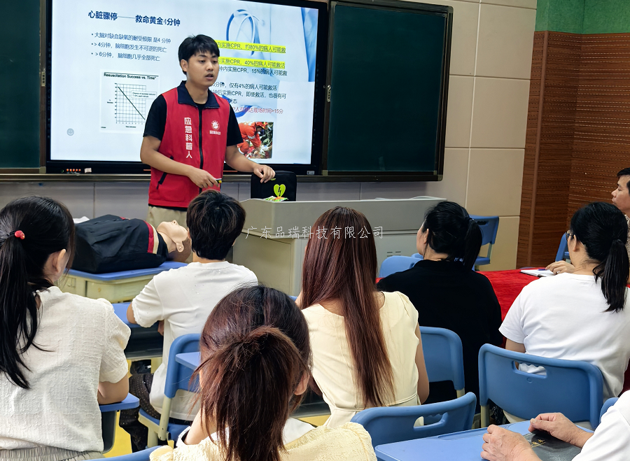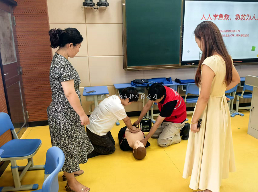 培训分为理论教学与实操演练两大模块。品瑞急救导师团队系统讲解了心肺复苏(CPR)标准流程、AED操作规范及气道异物梗阻处理等核心内容,重点演示了"评估环境-判断意识-胸外按压-人工呼吸-AED使用"的完整急救链条。参训教师分组进行了30:2按压通气比练习,并通过智能反馈设备实时矫正按压深度与频率。在新配置的AED训练机上,教师们模拟了电极片粘贴、语音提示跟随等标准化操作。