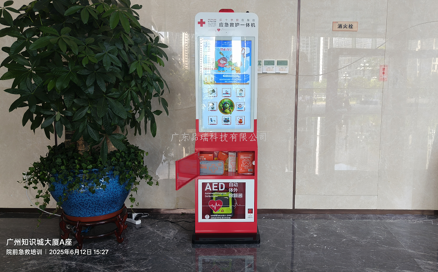 这台AI应急救援一体机,它装载这AED(自动体外除颤仪)、健康医疗防护包、投掷型灭火瓶、自发电手电筒、工具斧、消防自救呼吸器、自救口硝等。