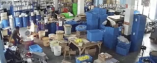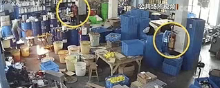 画面显示,9月29日12时48分40秒,该日用品加工企业的一名男员工进入香水灌装车间,调配并加热香水原料(异构烷烃混合物)。当他将加热后的香水原料倒入塑料桶时,一团火苗突然蹿起来。