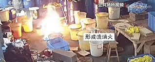 这时,塑料桶被大火彻底熔化,香水原料全部流出,形成流淌火。