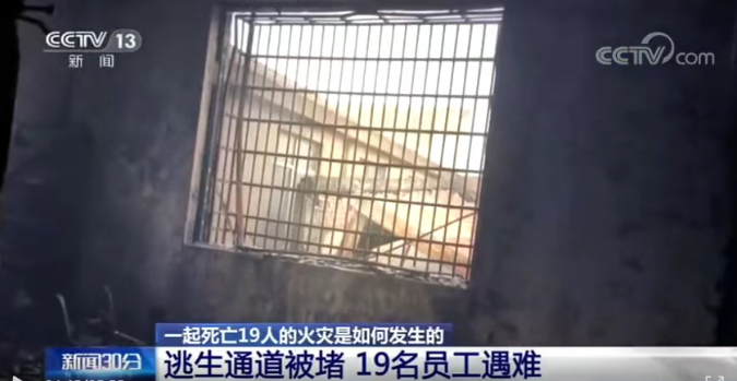 事后发现,这家日用品企业只有一部楼梯通往楼上,二楼和三楼生产车间的人员发现火情后有两人跳楼逃生,其余18人被涌向楼梯间的大量有毒浓烟封堵了逃生通道。而当他们返回车间时,一道道金属防盗网成了他们逃生的拦路虎,最终造成包括一楼香水灌装车间员工在内的19人死亡,3人受伤。