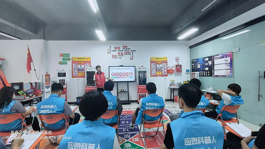 2025年7月3日上午,东莞南城中心小学,南城阳光第八小学教师们来到品瑞急救/应急科普人实训中心进行急救知识与技能学习。这是继两所学校布防AED之后进行的一次系统性课程学习。