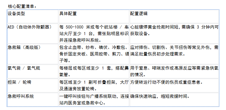 不同公共场所的人员密度、活动类型及潜在风险差异较大,急救设备的配置需结合场景特点、风险等级及相关标准科学规划。以下是常见交通枢纽的急救设备配置指南,结合场景需求、设备类型及配置逻辑展开说明: