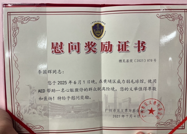 今年6月1日晚,一场惊心动魄的生命救援在黄埔区威力羽毛球馆上演。彼时,广州市东升医院ICU医生李国辉用专业与担当,使用球馆配备的AED,成功从死神手中夺回一条鲜活生命。