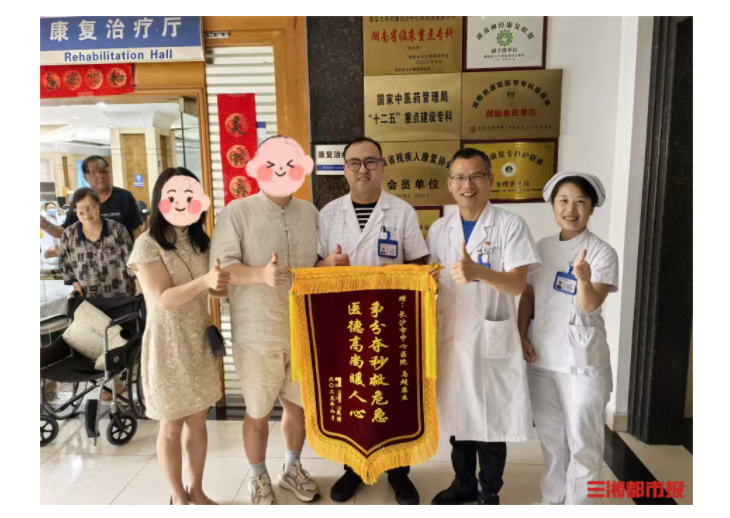吴建康复出院后,携家人专程来到长沙市中心医院康复医学科,将印有“争分夺秒救危急,医德高尚暖人心”金色大字的锦旗,郑重交到马超手中。