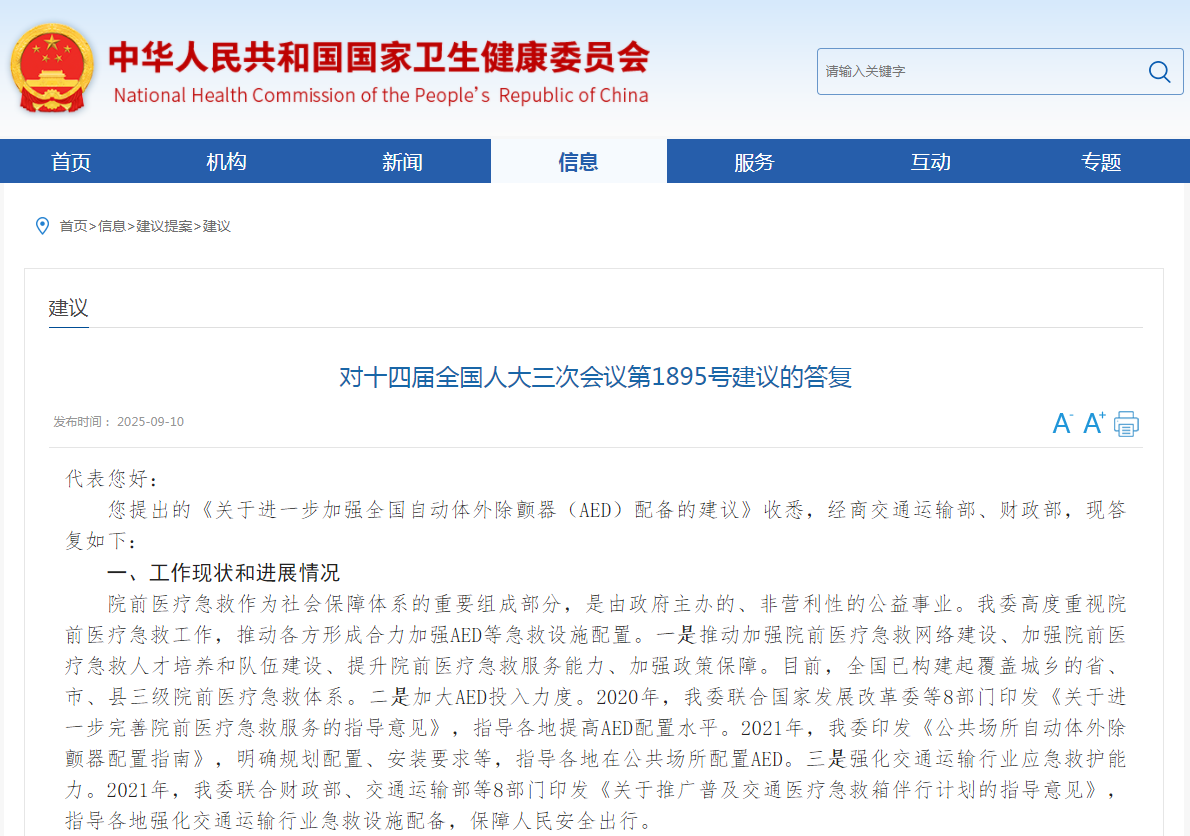 卫生健康委会同交通运输部、财政部,就加强 AED 配备的建议作出答复,提及此前已推动构建全国三级院前急救体系、印发 AED 配置指南及交通急救计划,当前明确将按院外心脏骤停发生率、人口密度等,在交通场站、学校等人员密集场所优先配置 AED,鼓励单位自主配置与社会捐赠,中央财政通过补助支持乡镇卫生院、县域医疗机构升级急救设备,企业捐赠可享税收优惠;同时推进航运领域(港口客运站、客滚船等)配置 AED 并明确相关标准,还将探索 AED 与导航软件、120 系统互联,后续会进一步落实配置要求、争取地方支持,研究大型客船配备 AED 及加强船员急救培训。