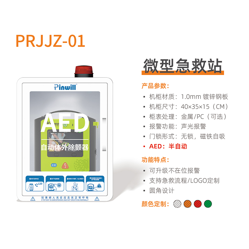 AED急救站,是一款搭建AED组合,结合场景应急救护使用的智能急救站。这是一款微型急救站,小型化,壁挂式。结合指示牌,急救看板,急救知识培训,打造急救一站式服务体系!