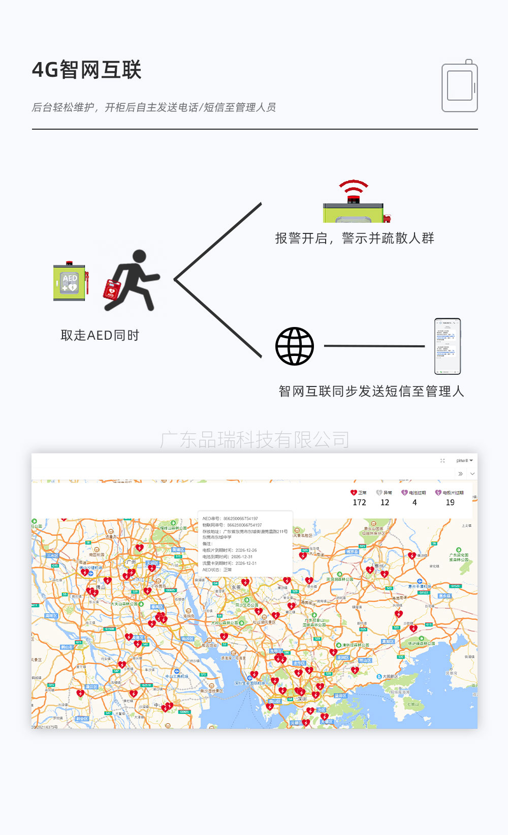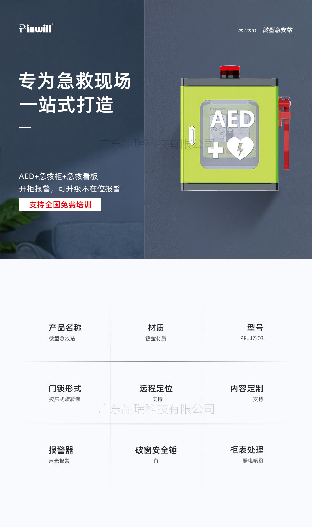 微型急救站 品瑞PRJJZ-03 AED急救 防水防尘,声光报警。AED自动体外除颤器结合体,支持联网,AED地图,定位等功能。适用于公共场所、校园、企业、体育馆、健身房、商超、社区等场所。