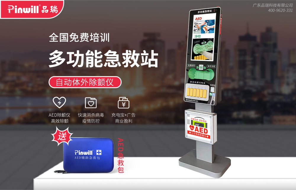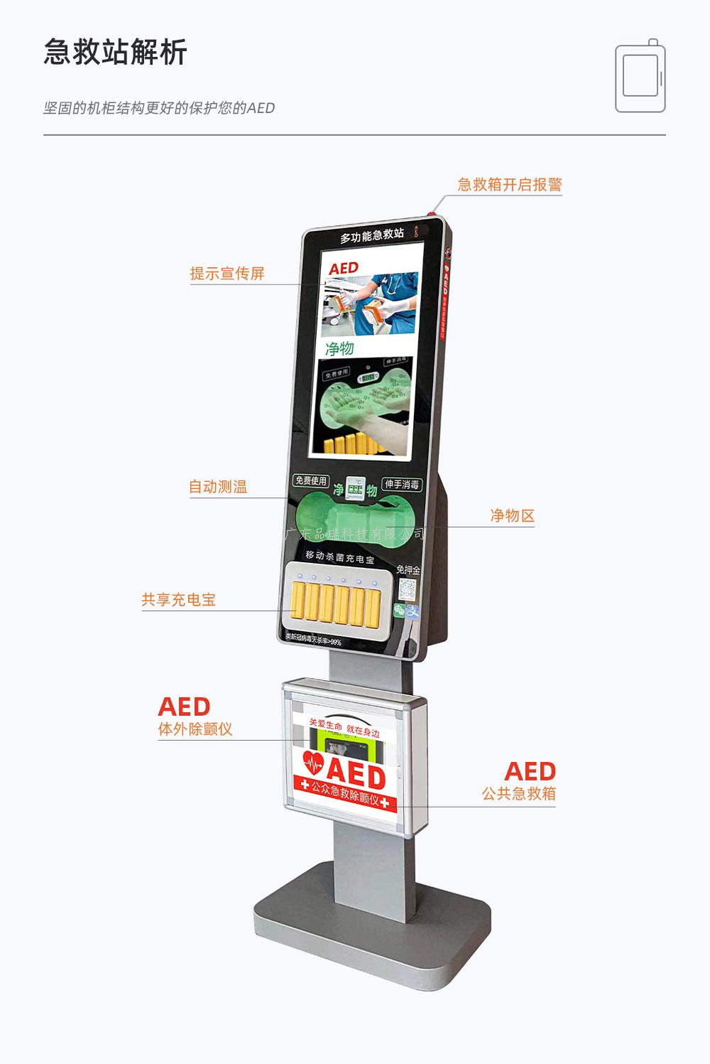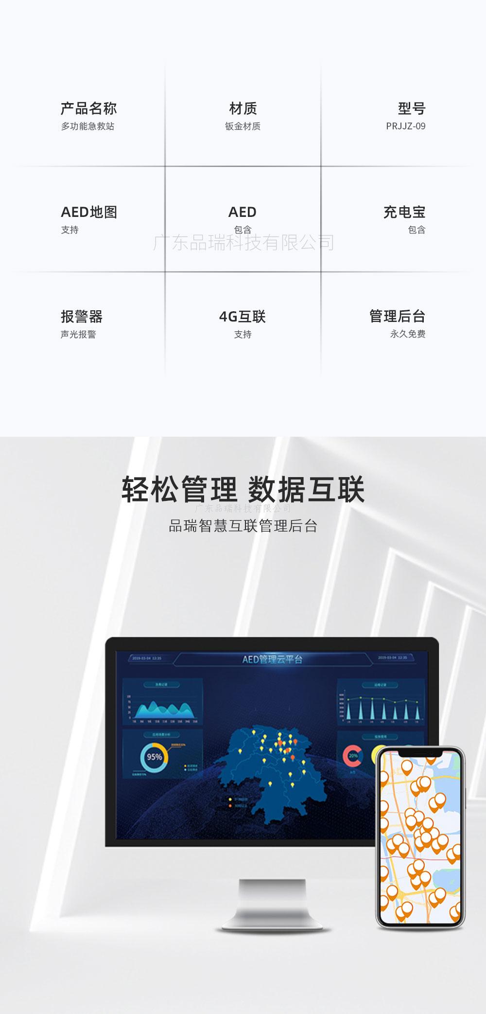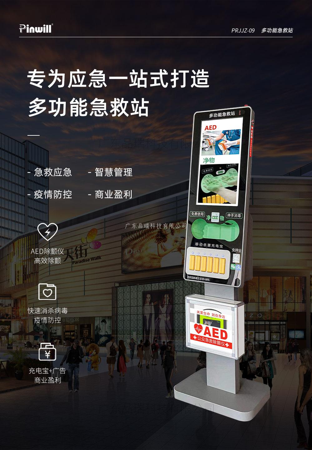 多功能急救站 品瑞PRJJZ-09 一款便民使用的综合急救站:带AED急救、医疗创伤急救包、消毒杀菌洗手喷雾、充电宝等多功能使用,把急救结合生活的便民急救一体机。