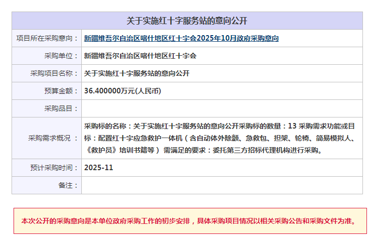 新疆地区2025年10月政府采购意向-关于实施红十字服务站的意向公开