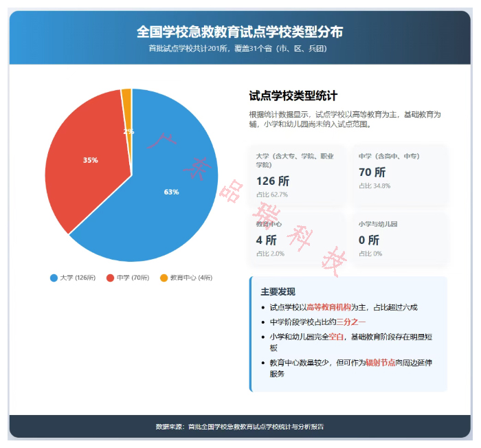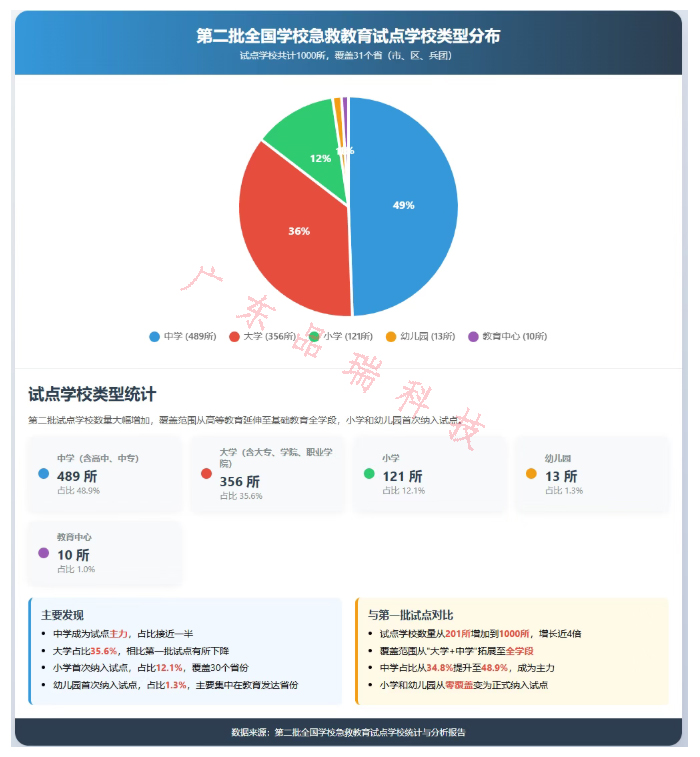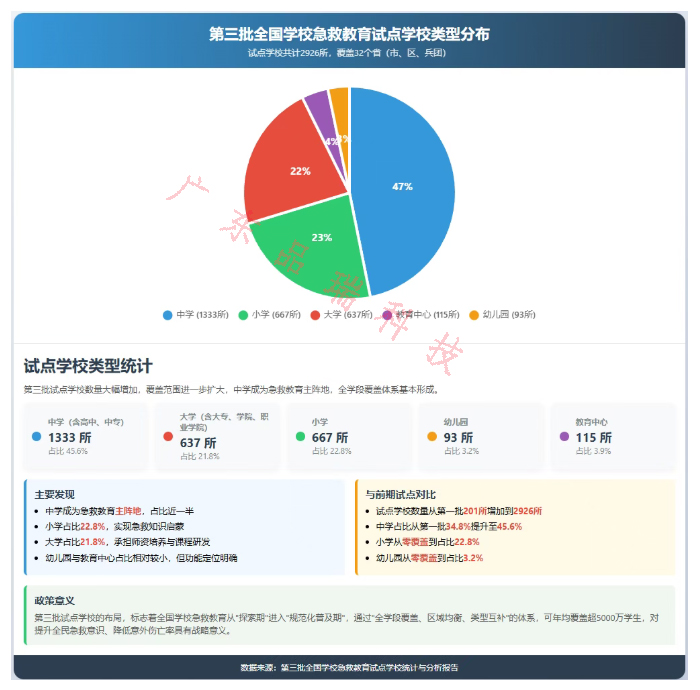 急救教育试点工作的推进历程,彰显了 “试点先行、逐步推广” 的科学逻辑。2021 年首批 201 所试点校启动时,以高校为核心载体(占比超 60%),依托医学类、综合类高校的专业资源搭建基础框架,31 个省(区、市、兵团)实现 “全覆盖”,为试点工作奠定根基。2023 年第二批试点规模扩展至 1000 所,首次纳入 121 所小学和 13 所幼儿园,打破基础教育低龄段空白,形成 “中学主力、高校支撑” 的格局,中学占比达 48.9%,成为急救技能推广的核心阵地。2025 年第三批试点进一步扩容至 2926 所,实现 K12 全学段深度覆盖 ——667 所小学、93 所幼儿园与 1333 所中学、637 所高校协同发展,115 所教育中心转型为区域服务枢纽,政策支撑也从 “无专项指南” 升级为 “大纲 + 指南 + 标准” 的标准化体系。