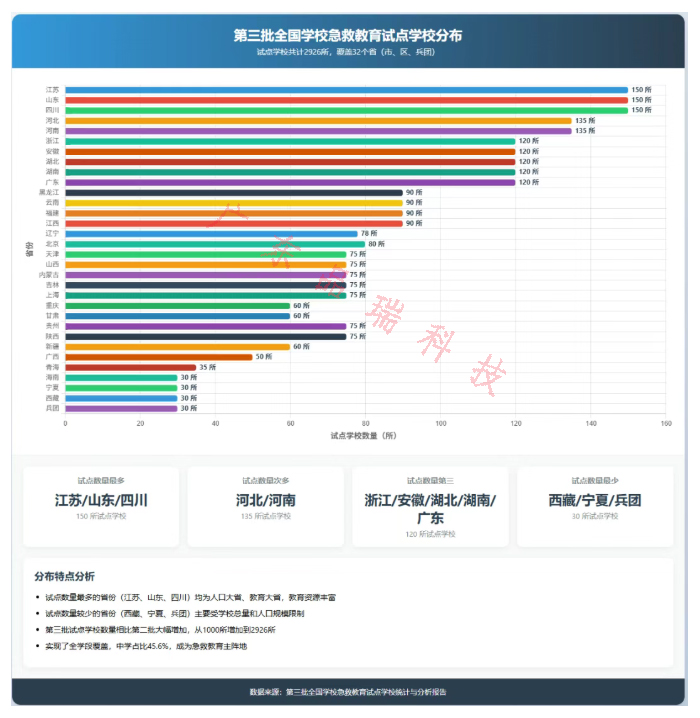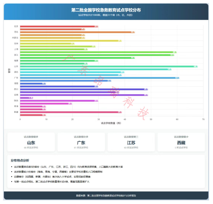 在区域布局上,试点工作呈现 “规模适配需求、区域兼顾公平” 的特征。山东、江苏、四川等教育大省以 150 所试点校形成引领梯队,依托 “高校研发 + 中学辐射” 模式覆盖千万学生;西藏、青海等边疆地区通过 30 所左右试点校实现地市全覆盖,西藏那曲市职业技术学校与拉萨市小学协同试点,填补边疆低龄段急救教育空白。这种差异化布局既保障了资源密集地区的示范效应,又破解了偏远地区 “师资短缺、设施不足” 的难题。