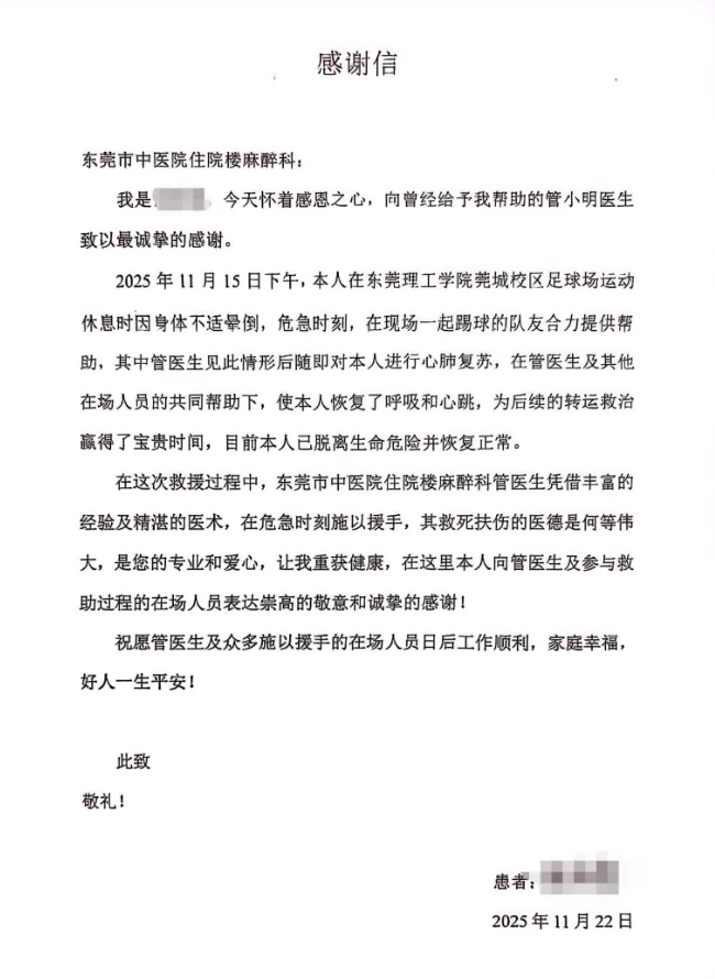 近日,广州中医药大学东莞医院(东莞市中医院)收到一份特殊的感谢信。市民饶先生在信中,向该院麻醉科管小明医生及参与救援的现场人员表达了诚挚谢意,感谢他们在其心跳骤停的危急时刻伸出援手,成功将其从死亡边缘拉回。